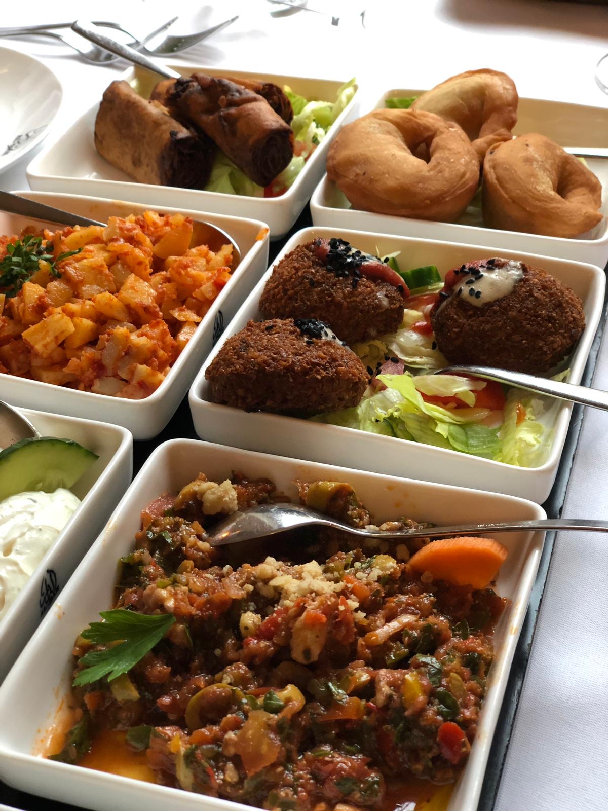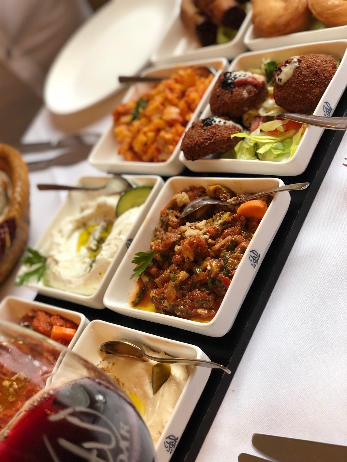 Und was wäre die orientalische Küche ohne die Mazza? Hier zählt die Gemeinschaft, man dippt und probiert sich gemeinsam durch die große Auswahl an kalten und warmen Vorspeisen, kann sich Gesprächen und Genuss gleichermaßen widmen. Auf den Tisch kommen bei der vegetarischen Variante Tabuleh, Olivensalat, Falafel, Hommus, Muhammara, Lebneh, dazu vier weitere Überraschungsmazza gereicht mit arabischem Brot. Und mit Fleisch Sambusik-Sujuuk, Sambusik-Lamm sowie hausgemachte Weinblätter.