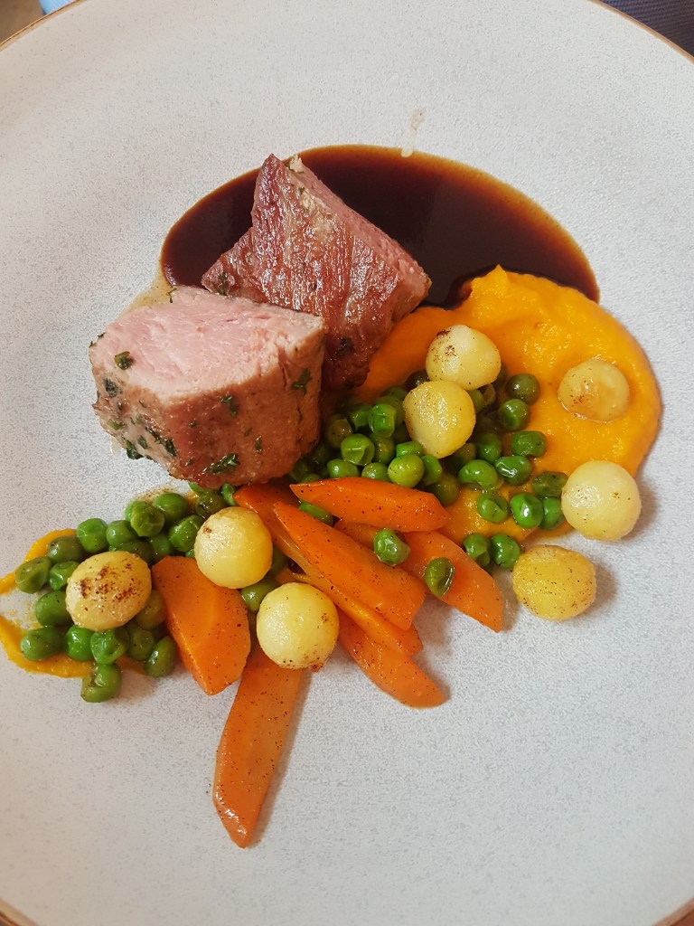 Noch ein Schluck Wein und weiter geht es mit Loup de mer mit cremigen Kartoffelpüree und buntem Gemüse, Mairübchen und einer Zitronenbuttersauce auf der einen Seite und Kalbsfilet, Pariser Kartoffeln, Erbsen à la Créme und einem fabelhaften Kalbsjus auf der anderen Seite.