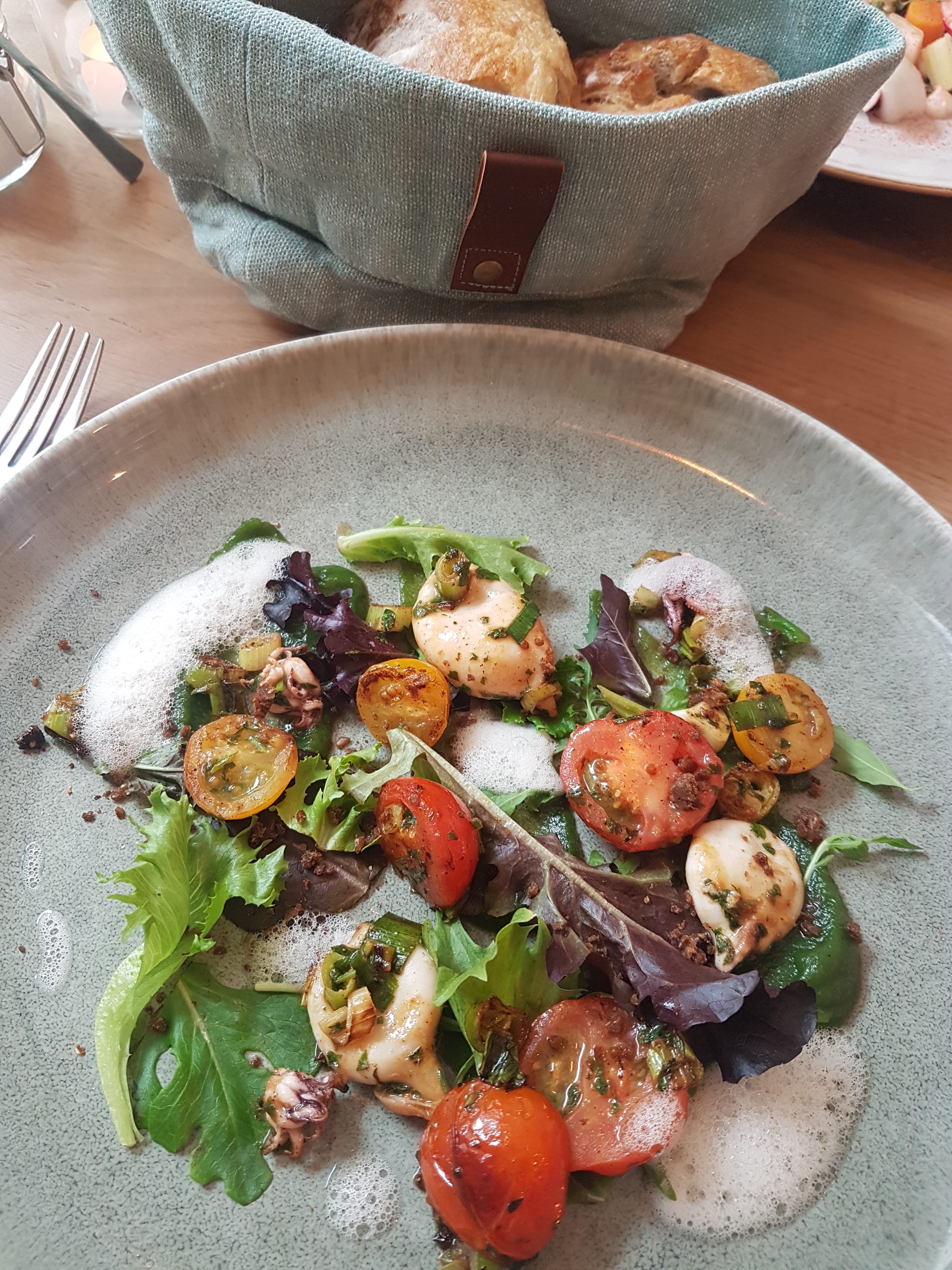 Ich entscheide mich für ein reines Fischmenü. Nach einem Gruß aus der Küche bekomme ich also kleine zarte sautierte Tintenfische mit Wiesenkräuterpürée und Tomaten und Knoblauch.