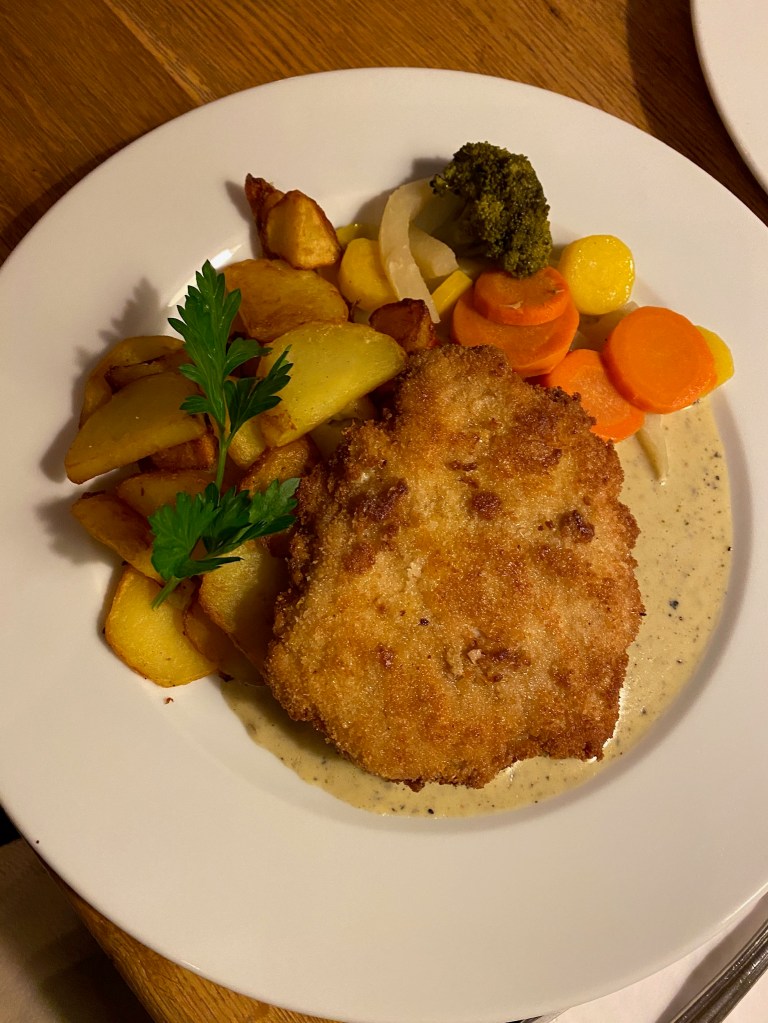 Cordon Bleu mal anders, nämlich mit Fenchelsalami und Ziegenfrischkäse. Pfeffer ist eindeutig aus der cremigen Sauce des Cordon Bleus herauszuschmecken. Würzig ist das Gericht allemal – denn zum grünen Pfeffer kommt noch die Wurst hinzu, die dem gefüllten Schnitzel einen weiteren Geschmackskick verleiht.
