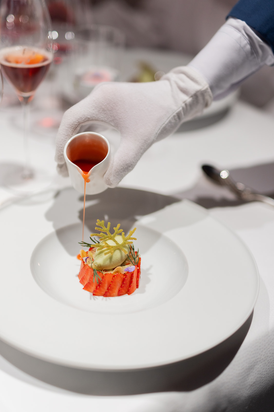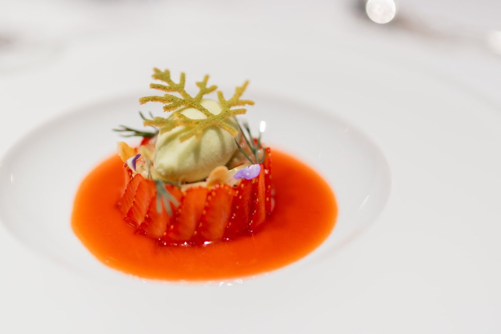 Das letzte Dessert kommt duftend auf den Tisch. Fenchel als Sorbet mit weißem Nougat und Lavendel mit Erdbeer-Jus aufgegossen. Ein traumhafter Abschluss und das nicht nur optisch.