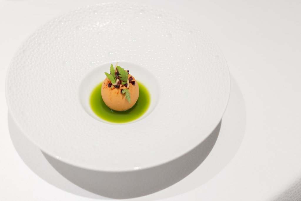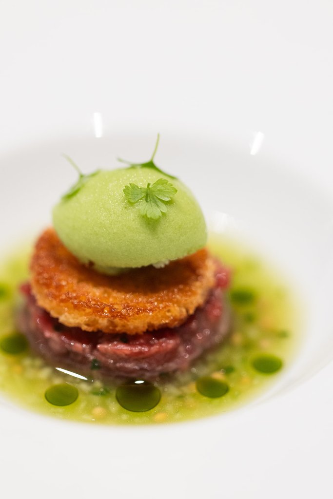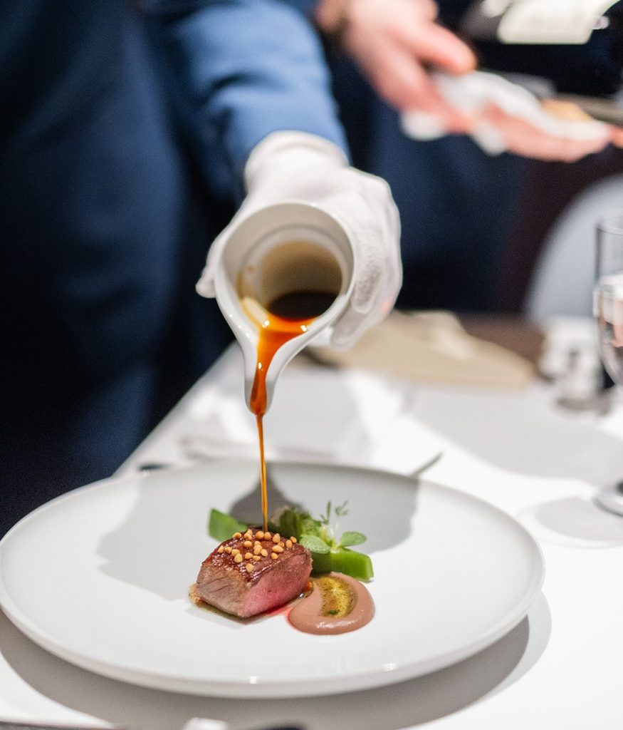 Zur Einstimmung gibt es karamellisierte Kalamata Olive. Die Kalamata Olive sei eine Hommage an die Zeit Sven Elverfelds auf Kreta in Griechenland, wie Director of Sales & Marketing, Marcus Reiser, uns erzählt. Die tauche immer wieder auf den Menüs des Küchenchefs auf. Weiterhin gibt es eine Makrele auf Buchweizen mit Physalis. Gefolgt von Rindertartar, Gurke und Whiskey. Wie man merkt, sind es meist nur ein paar Komponenten, die in interessanten Kombinationen wirksam werden. Reiser: „Sven Elverfeld bevorzugt einfache Produkte wie Gurke und Buchweizen eher als Luxusprodukte.“ So würde bei ihm nie Hummer auf den Tisch kommen, dafür aber gerne saisonale Kräuter für seinen Tafelspitz, erklärt uns Reiser.