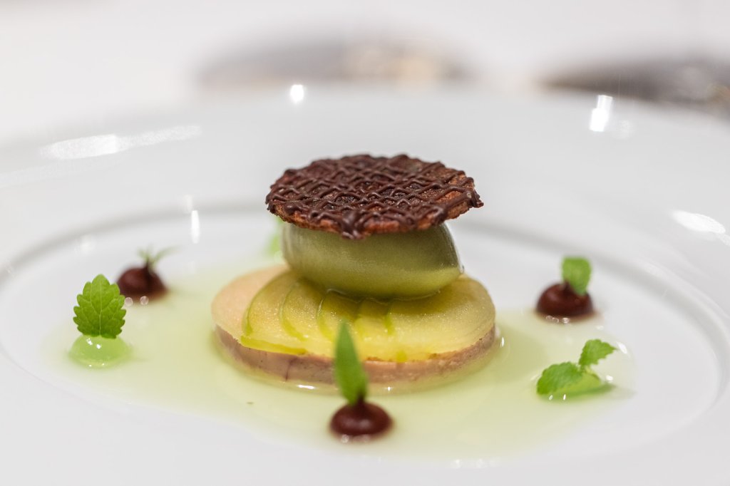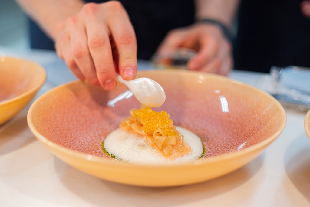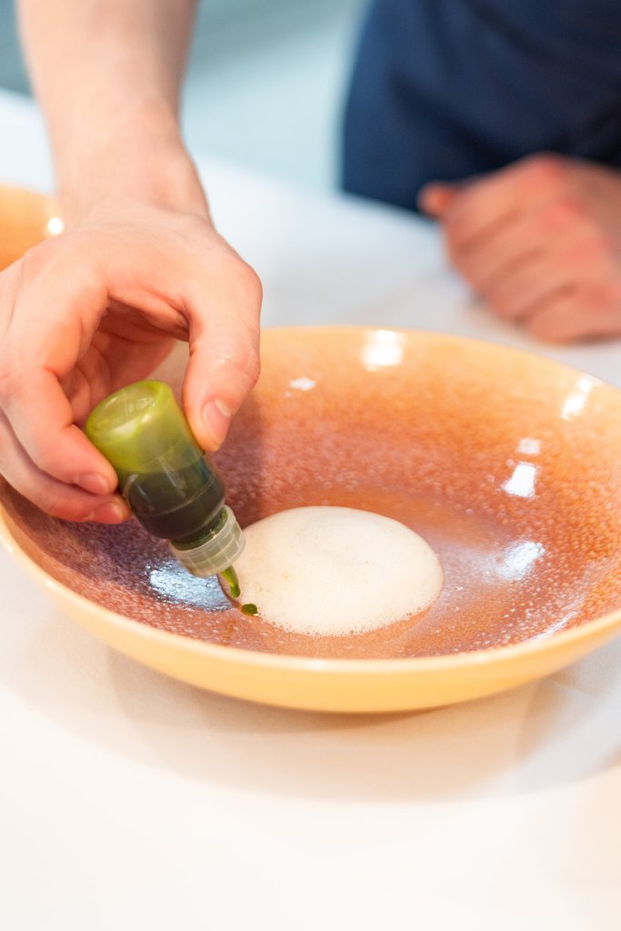 Das eigentliche Menü beginnt mit Gänseleber mit grünem Apfel und an Match, Zitronenverbene und & Alpaco Schokolade. Weiter geht es mit Sicher Saibling und seinem Kaviar. Hübsch angerichtet mit Kohlrabi, Haselnuss, Dill und Sauerklee, wurde der Fisch unter der Wärmebrücke am Pass zwölf Minuten schonend gegart. „Dadurch zieht er ganz langsam durch“, erklärt uns Reiser. Den Sud fangen wir mit einem Gourmetlöffel auf. Köstlich!