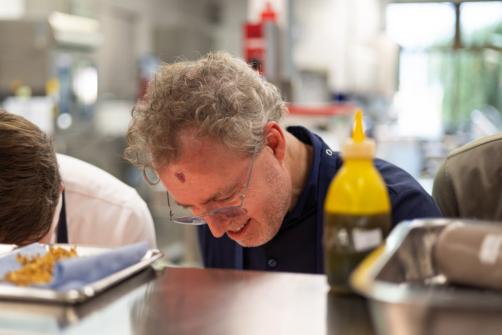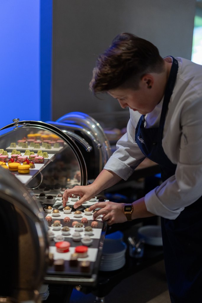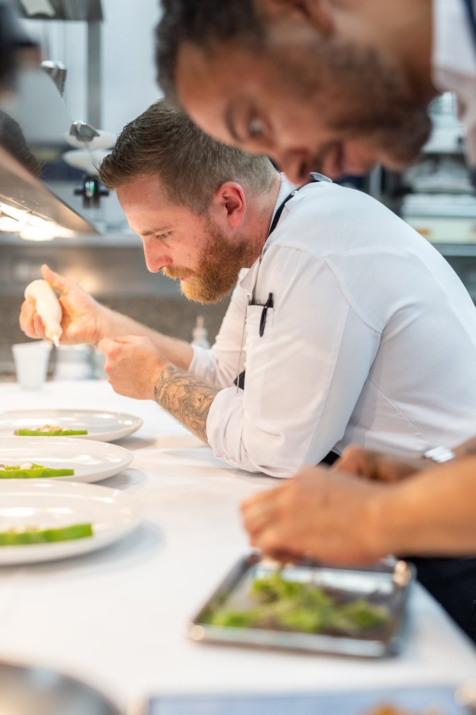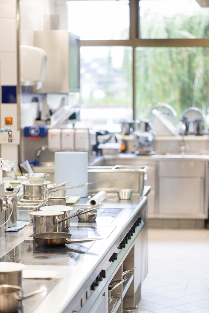 Ein weiteres Highlight war unser Besuch in den heiligen Hallen von Sven Elverfeld und seinem Küchenteam. Über eine automatische Tür, die mit vielen Auszeichnungen beklebt ist, gelangen wir in die geräumige Küche mit ausreichend Platz für die hauseigene Konditorei, die Bäckerei und das acht-köpfige Küchenteam. In der Küche herrscht eine konzentrierte Ruhe. Uns fällt sofort das große Fenster mit Blick auf Wasser und Bäume auf – das gibt es selten in gastronomischen Küchen. Wir nehmen eine gewisse Anspannung wahr – aber keine Hektik. Sven Elverfeld und sein Team funktionieren wie ein Schweizer Uhrwerk. Jeder Handgriff sitzt. Ein sehr professionelles und respektvolles Miteinander.