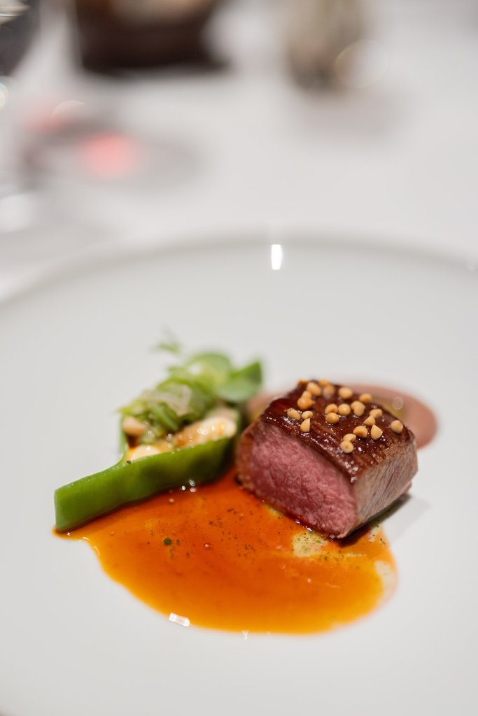Das große Finale ist der Lammrücken mit Oliventapenade an Bohnenallerlei und gerösteten Pinienkernen. Das auf den Punkt gegarte Stück Lamm aus deutscher Zucht ist ein Genuss und zergeht auf der Zunge. Der Jus wurde viele Tage eingekocht und verleiht dem Fleisch eine süße Note.