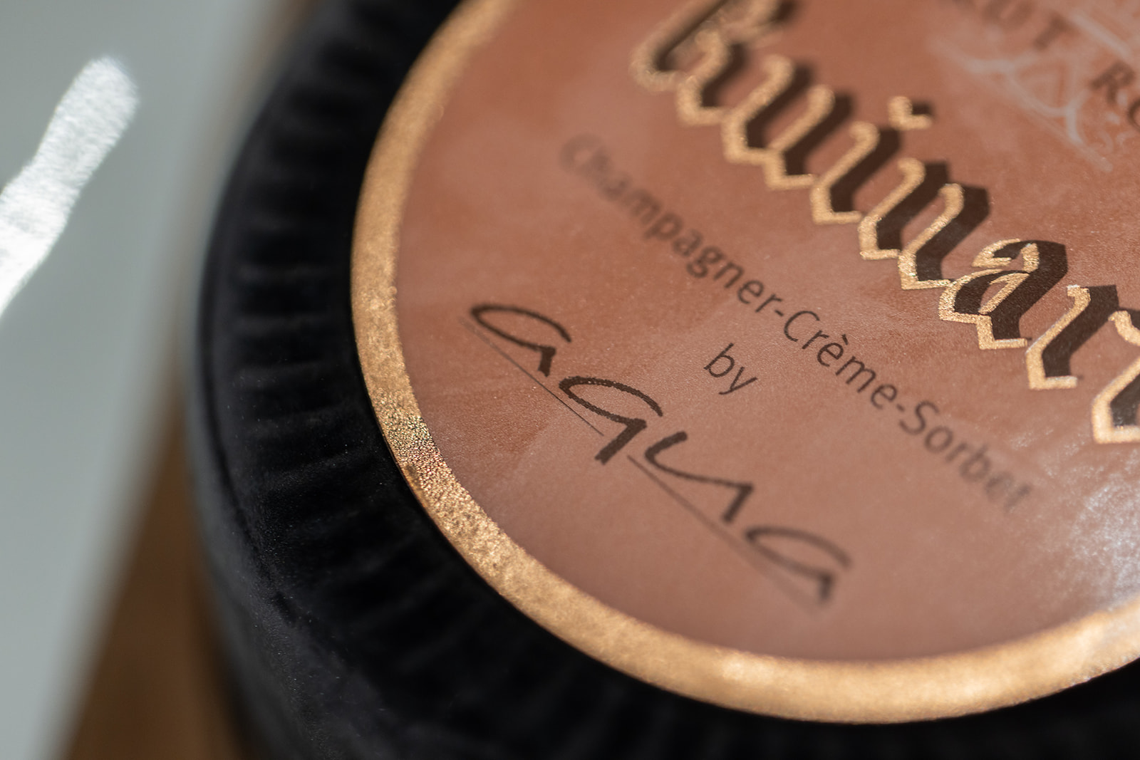 Im Anschluss folgt das Signature Dish von Sven Elverfeld. Ein Dessert, das seit 23 Jahren auf der Karte steht: das Champagner Cremesorbet „Edition Ruinart Rosé“. Mathis Post, der Demi-Chef de Rang zieht den „Sorbet-Abdecker“, der von dem Kindereis „Ed von Schleck“ inspiriert sei, mit einer Pinzette vorsichtig ab. Bei der Schale des Desserts, handelt es sich um einen abgeschliffenen Original Runiart-Rosé-Flaschenboden. Der Champagner lande also wieder in der Flasche, erklärt uns Marcus Reiser den Gedankengang dahinter. Der abgeschnittene Boden ist in einem Stück Holz aus dem Rüttelpult eingesetzt. Der Korken dient als kunstvolle Dekoration.