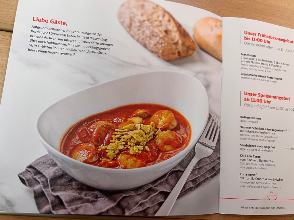 Ich greife also zur Speisekarte. Ein Teller mit schmackhaft angerichteter Currywurst lächelt mich an. Doch dann lese ich den Satz: „Aufgrund technischer Einschränkungen in der Bordküche können wir nur eine Auswahl unseres Angebots anbieten.“ Ok – Currywurst scheint es trotzdem zu geben und ich schreite hoffnungsvoll zum Tresen.