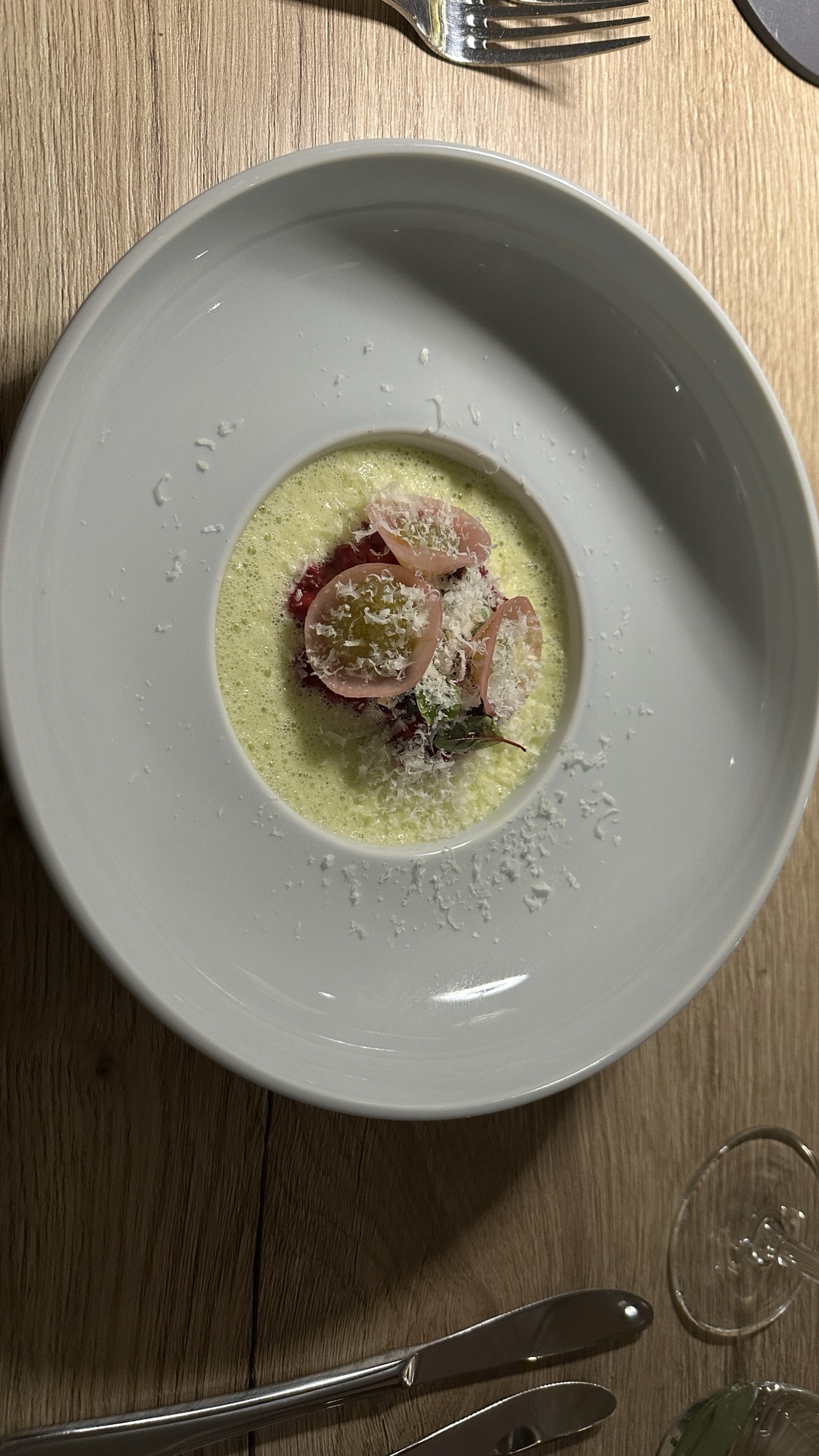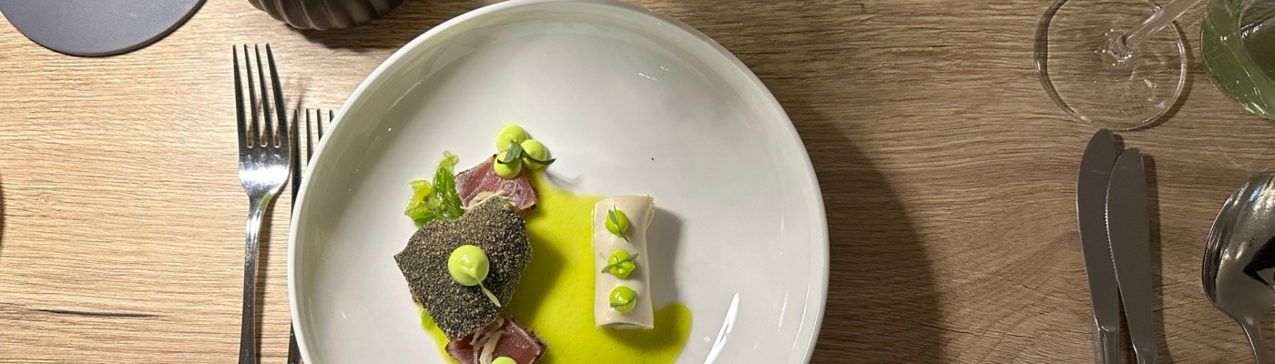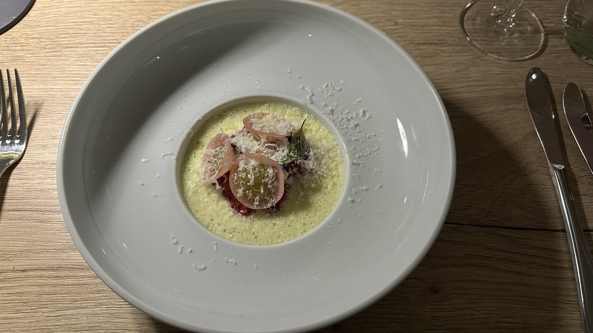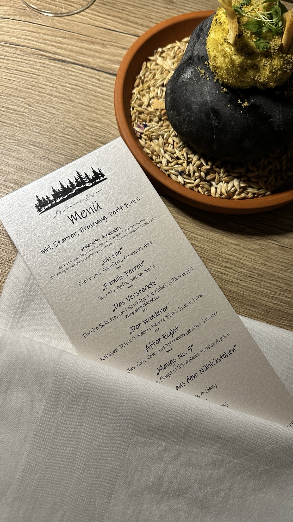 Schnell eingecheckt und im gemütlichen Hotelzimmer „frisch“ gemacht, geht es ins Restaurant. Das Interieur gefällt uns sofort: Es besticht durch ein gediegenes Ambiente in weiß und grün sowie Materialien aus Holz und Samt. Das Service-Personal, darunter der Vater des Chefkochs Johannes Steingrüber, bewegt sich ruhig durch das Lokal. Schnell merken wir: hier kann man sich zurücklehnen und entspannen. Wir fühlen uns sehr umsorgt.