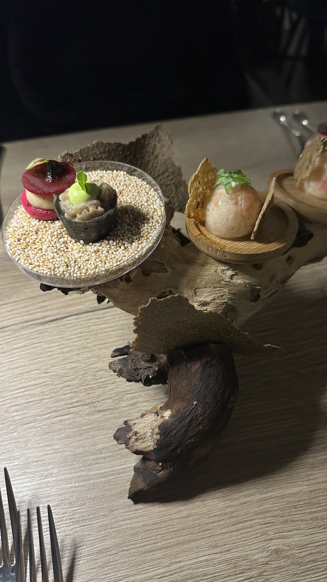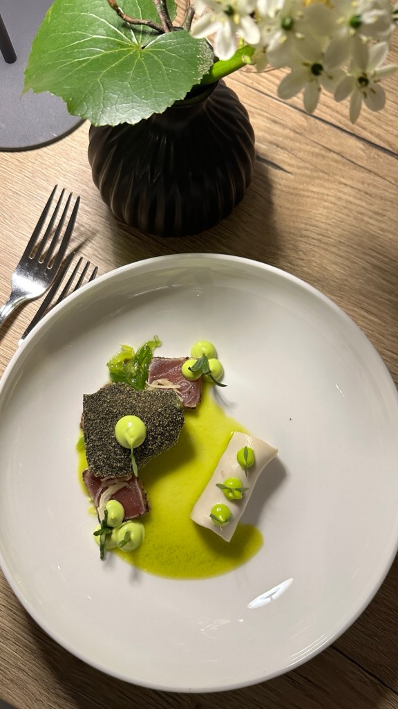 Ohne Erwartungen in ein Restaurant zu gehen, ist wahrscheinlich immer gut. Desto eher können sie übertroffen werden. Jedenfalls ist es in diesem Fall so. Ahnungslos nehmen wir an den Tischen Platz. Butter und Brot, aus zwei Tage gereiften Sauerteig aus Seesen, und Streichfett mit Rosmarin und Orangenöl werden gereicht. Zum Appetit anregen gibt es den Drink „Wolke 7“ – ein französischer Lavendel-Aperitif mit weißem Portwein, der von Restaurantleiter Marcel Schmidt mit Haussekt aufgegossen wird. Ein prickelnder und schmackhafter Auftakt. Schmidts Weinauswahl, passend zum Menü, wäre noch ein eigener Blog-Eintrag wert. Vom Weißwein, über Rosé, bis hin zum Rot- und Dessertwein, hat er immer den passenden Schluck parat. Und auch Ann-Kathrin Werner hat mit der von ihr kreierten alkoholfreien Begleitung, die unter anderem aus einem Kokoswasser, Korianderöl und Koriandersud sowie einem in Apfelholz geräuchertem Apfel-Birnensaft besteht, positiv überrascht. Nach dem Amuse geule aus einer gelierten Lachstartar-Kugel, Kalbstartar und einem Macaron aus ungestopfter Gänseleber sowie Knäckebrot, beginnt das eigentliche 6-Gang-Menü. Es war nicht nur geschmacklich ein Hochgenuss, sondern auch eine ästhetische Augenweide. Lasst euch das Menü hier optisch einmal auf der Zunge zergehen…