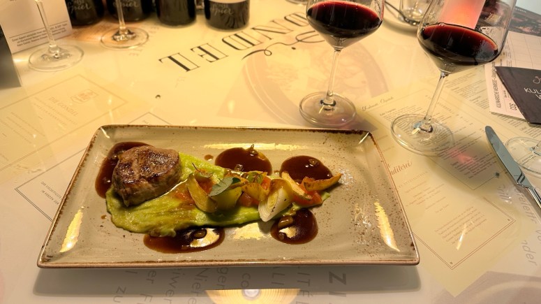 Der cremige Genuss ging mit dem dritten Gang, dem pochiertem Ei, Barläuch, Belper Knolle und Brioche-Croutons weiter. Auch hierzu reichte Sommelier Steffi zwei Weine zum Probieren. Den Chenin Blanc sowie einen Sauvignon Blanc ergänzten den Bärlauch-Schaum wunderbar. Ein frühlingshafter Gang aus der Küche! Unter den Gästen ging es spätestens ab diesem Gericht gesellig zu. Zwischen den Zweiertischen wurde gemeinsam degustiert und über Aromen gefachsimpelt. Aber auch die Besucher, die alleine in die Gondel zur Weinreise kamen, wurden dank des fürsorglichen Service gut umsorgt und fühlten sich nie allein.