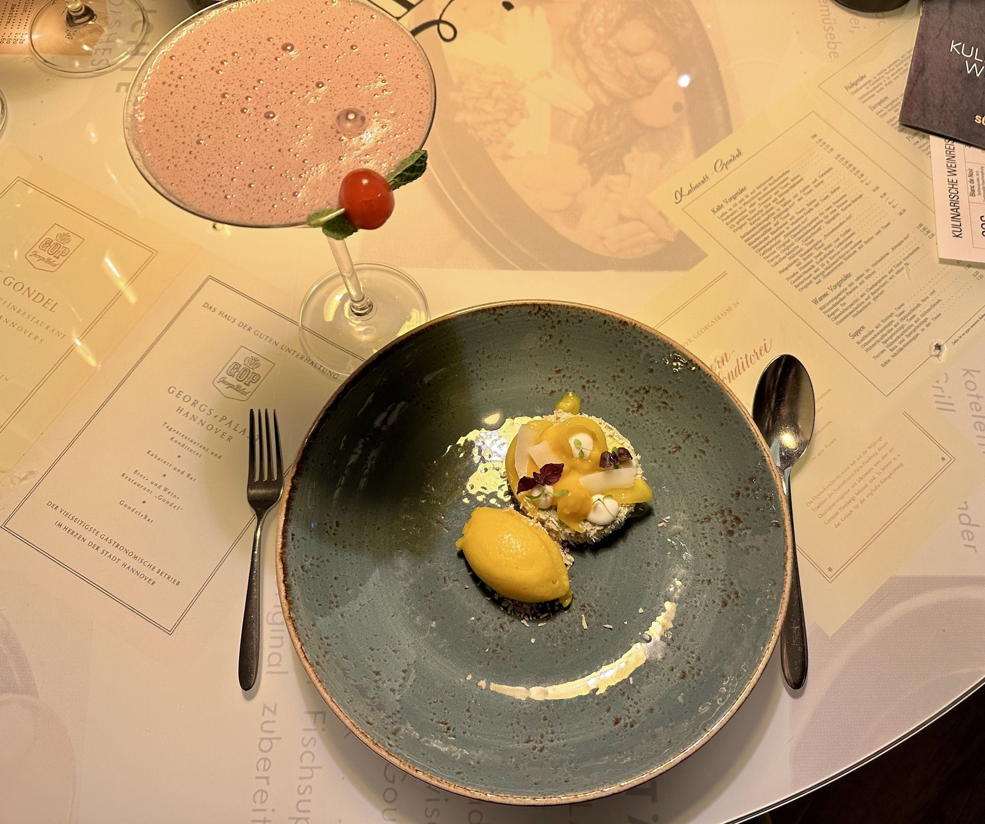 Aber natürlich darf bei solch‘ einem Gaumenschmaus ein süßer Abschluss nicht fehlen. Das Gondel-Dessert kommt als farbenfrohes Gericht auf den Tisch. Mango-Sorbet, Kokosnuss und Thai-Basilikum bilden den Kern dieser fruchtigen Süßspeise, die mit dem Cocktail „African Queen“ serviert wird. Paul-Ètienne erklärt dazu: „Wir wollten einen Drink kreieren, der zur Mango passt und geschmacklich etwas Neues bietet.“ Gelungen – kann man dazu nur sagen.