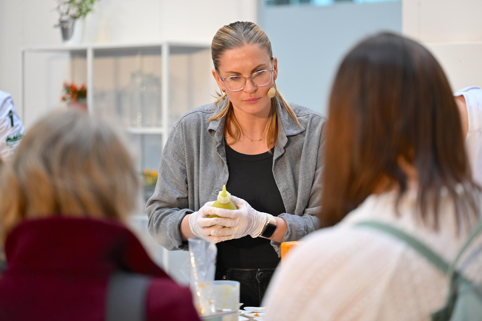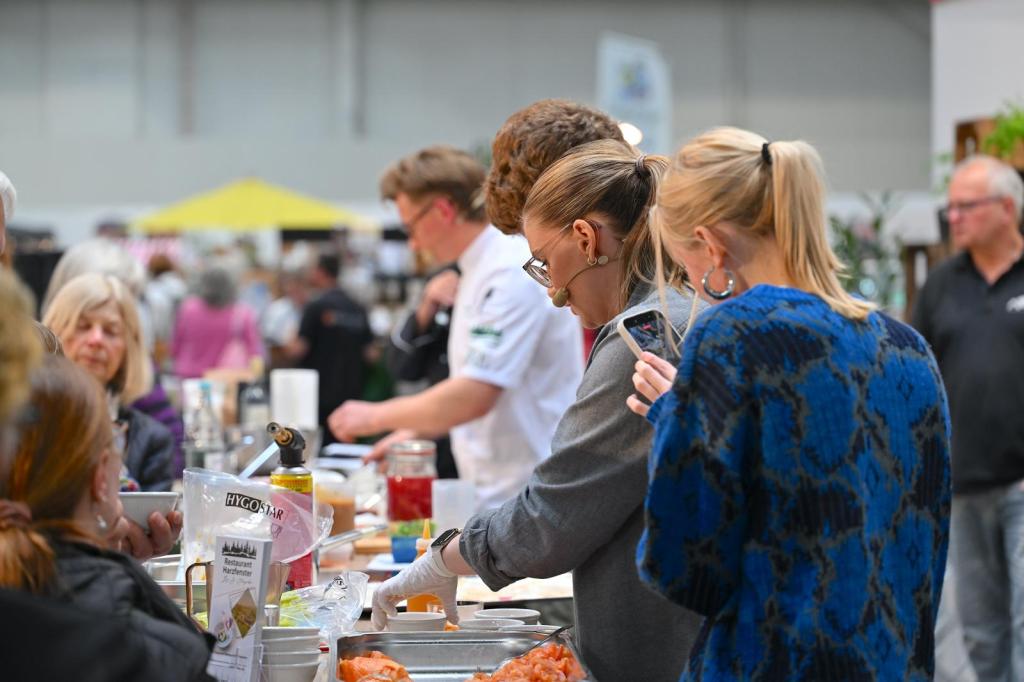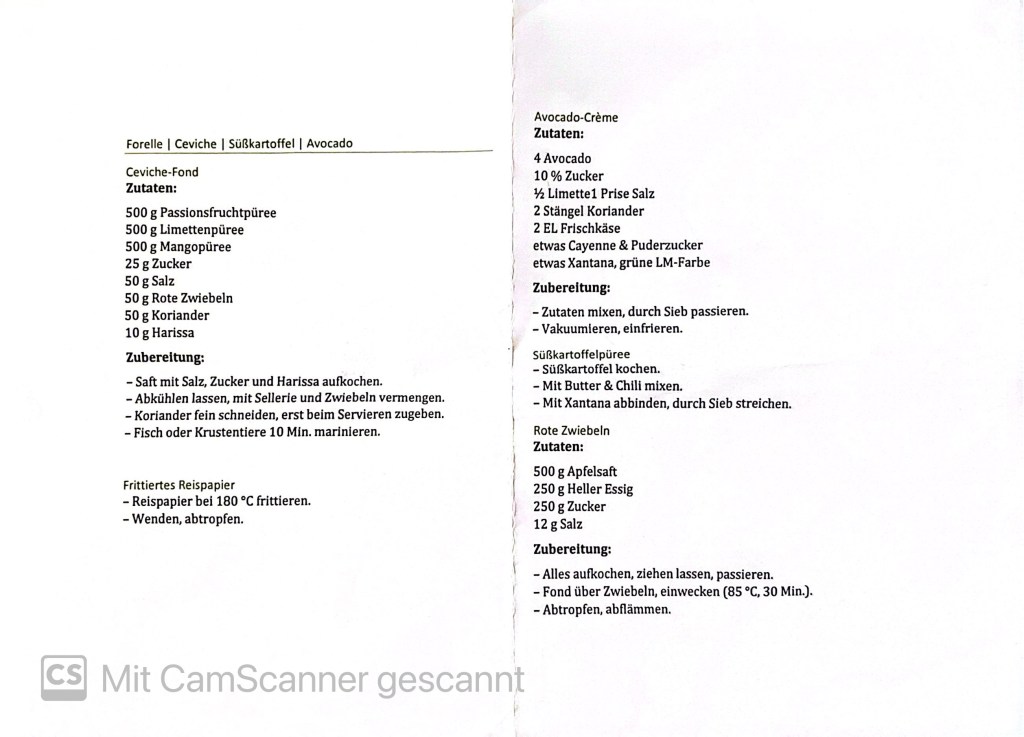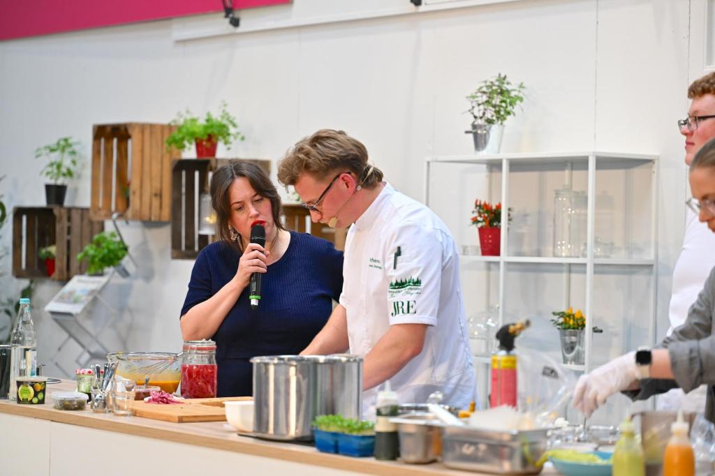Im Publikum folgten nicht nur hungrige, sondern vor allem interessierte Gäste aufmerksam dem Geschehen. Kein Wunder, hatte Johannes Steingrüber doch wirklich spannende Speisen im Gepäck. Auf dem Menü stand an diesem Tag: Ceviche von der Forelle mit Süßkartoffel und Avocado auf einem exotischem Fruchtpüree (Rezept siehe unten).