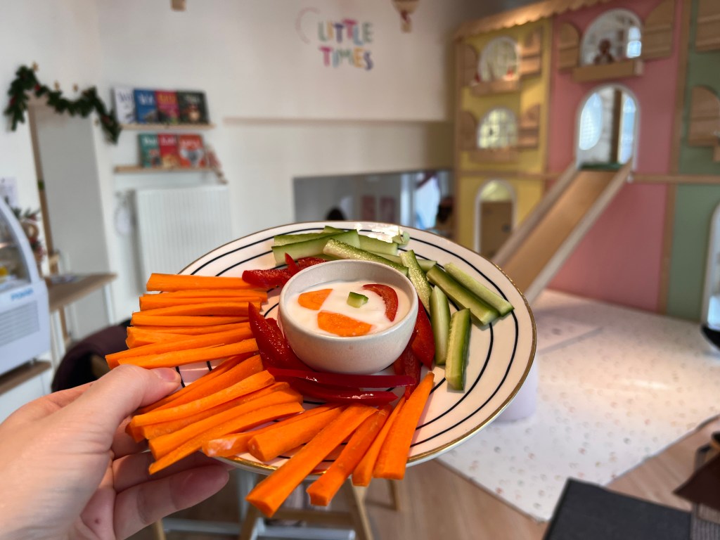 Es gibt drei Spielbereiche für Kinder von null bis fünf Jahren. Einen Montessori-Baby-Bereich, ein Areal mit Kaufmannsladen, Polizei und Krankenhausinterieur sowie einen Raum zum Rutschen im Obergeschoss. Für die Mamas und Papas – und alle die mit den Kleinen ins Little Times kommen – gibt es eine lange Tafel zum Essen und Trinken.