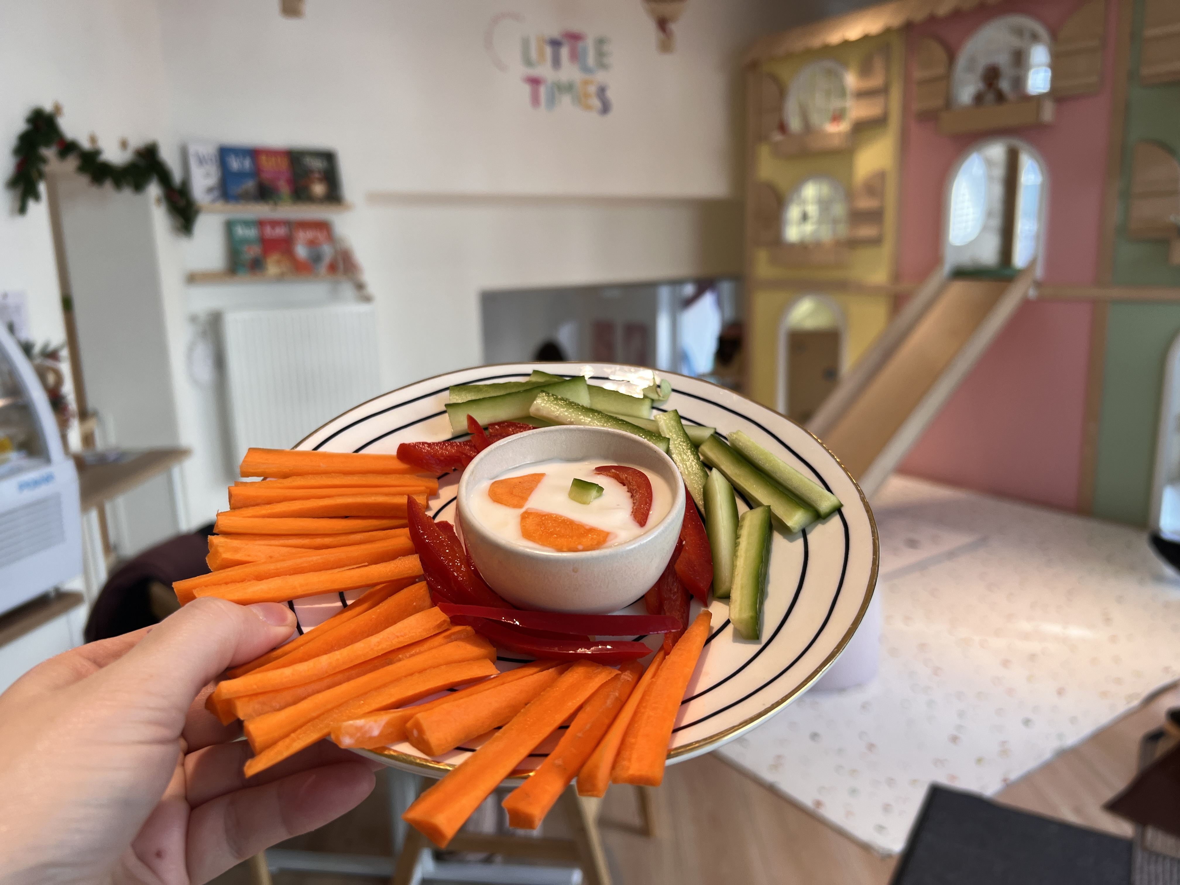 Es gibt drei Spielbereiche für Kinder von null bis fünf Jahren. Einen Montessori-Baby-Bereich, ein Areal mit Kaufmannsladen, Polizei und Krankenhausinterieur sowie einen Raum zum Rutschen im Obergeschoss. Für die Mamas und Papas – und alle die mit den Kleinen ins Little Times kommen – gibt es eine lange Tafel zum Essen und Trinken.