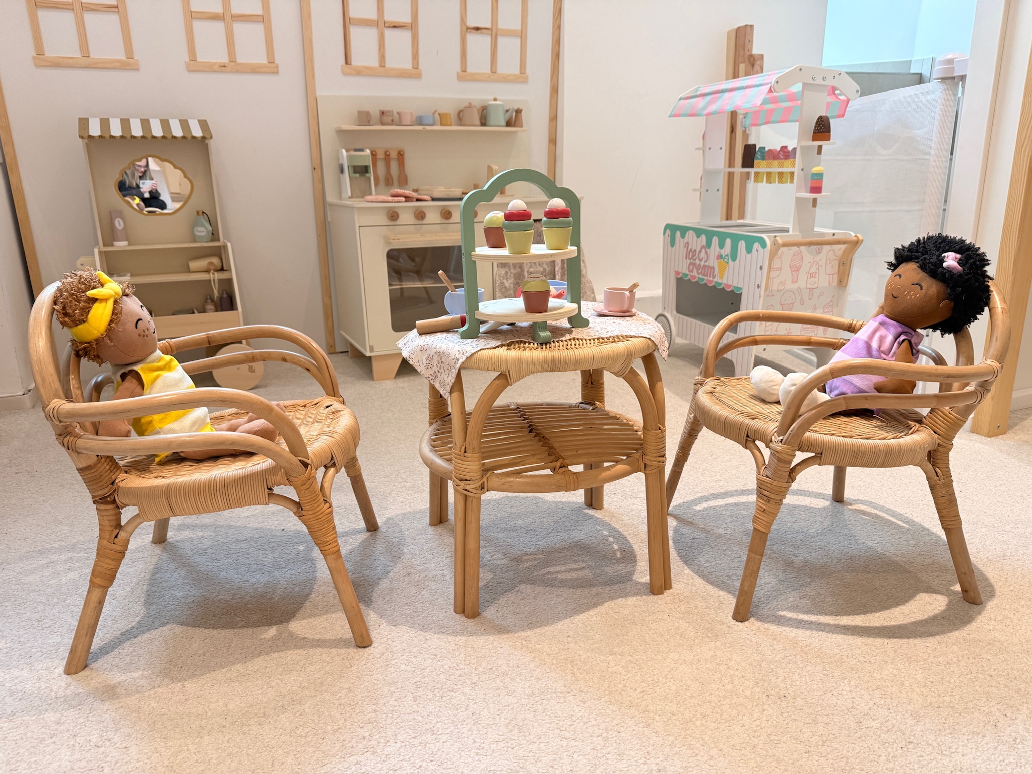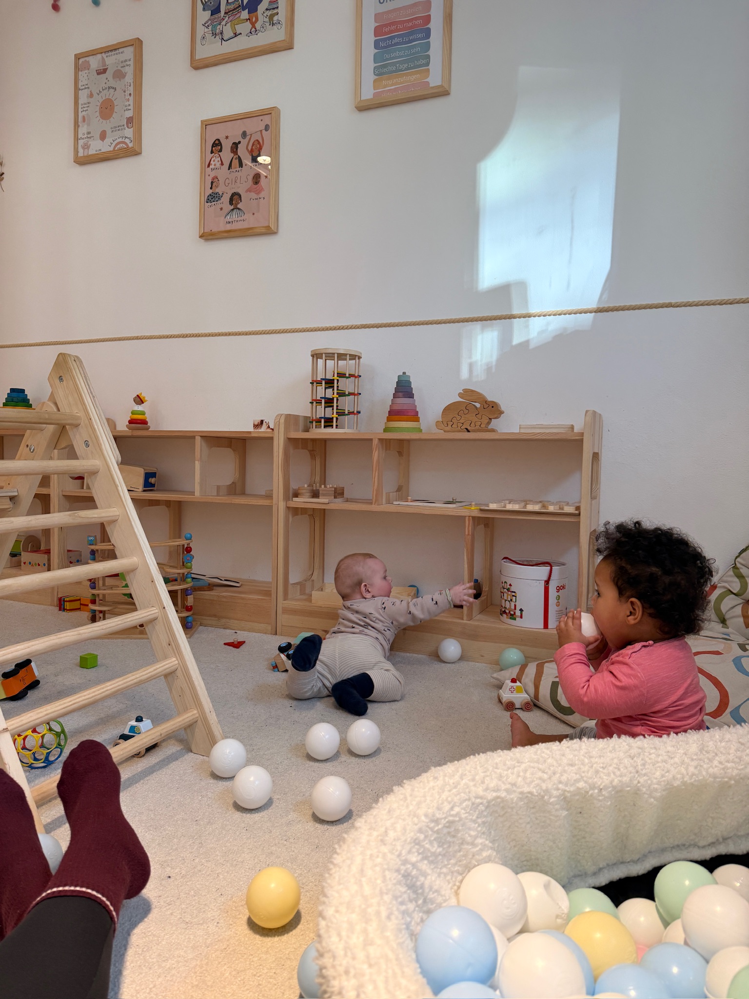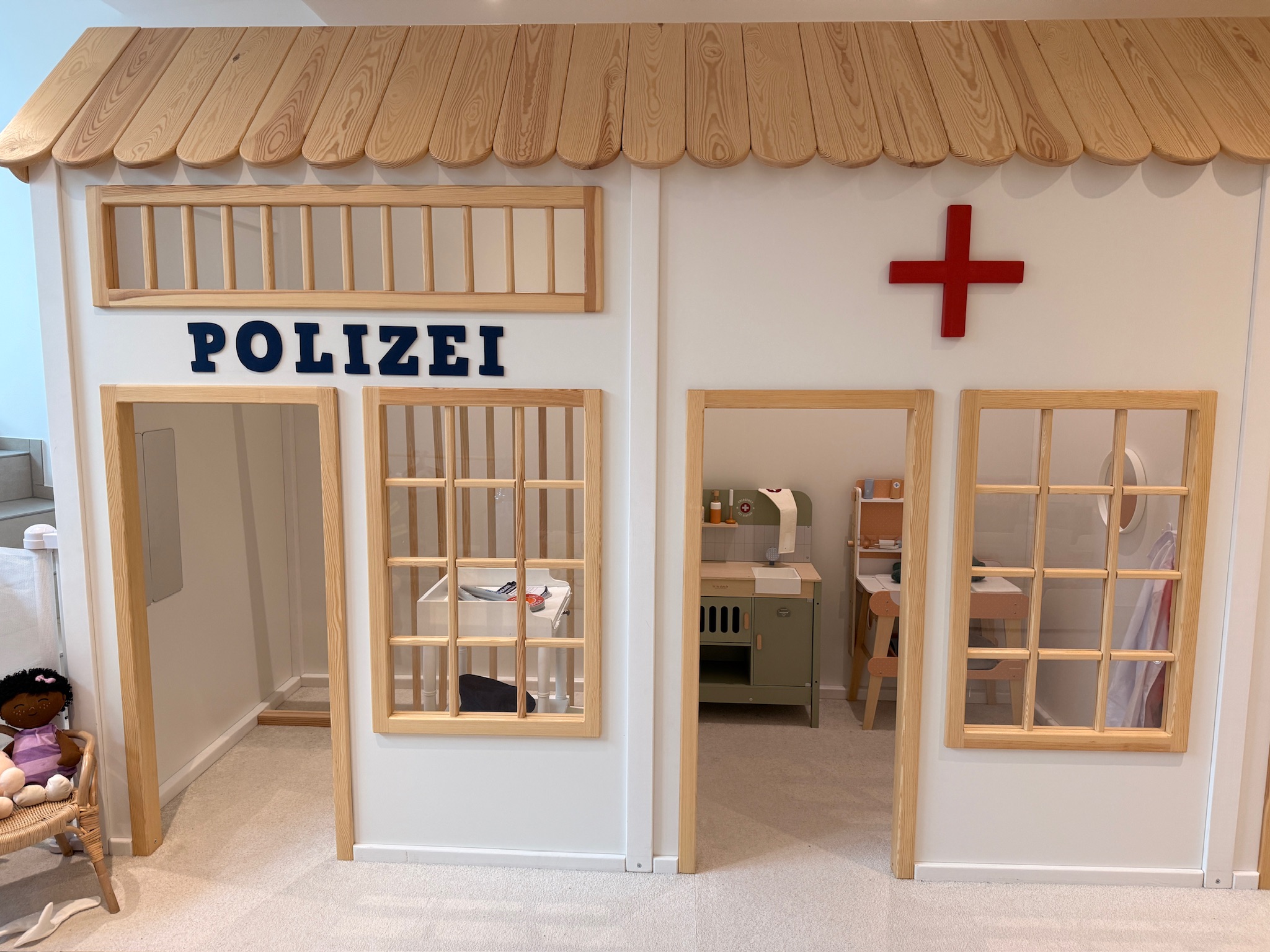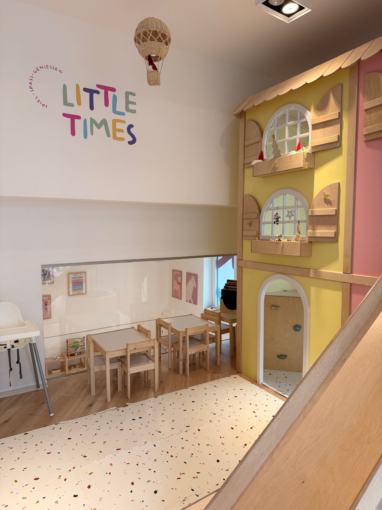 Es gibt drei Spielbereiche für Kinder von null bis fünf Jahren. Eine Montessori-Baby-Bereich, ein Areal mit Kaufmannsladen, Polizei und Krankenhausinterieur sowie einen Raum zum Rutschen im Obergeschoss. Für die Mamas und Papas – und alle die mit den Kleinen ins Little times kommen – gibt es eine lange Tafel zum Essen und Trinken.
